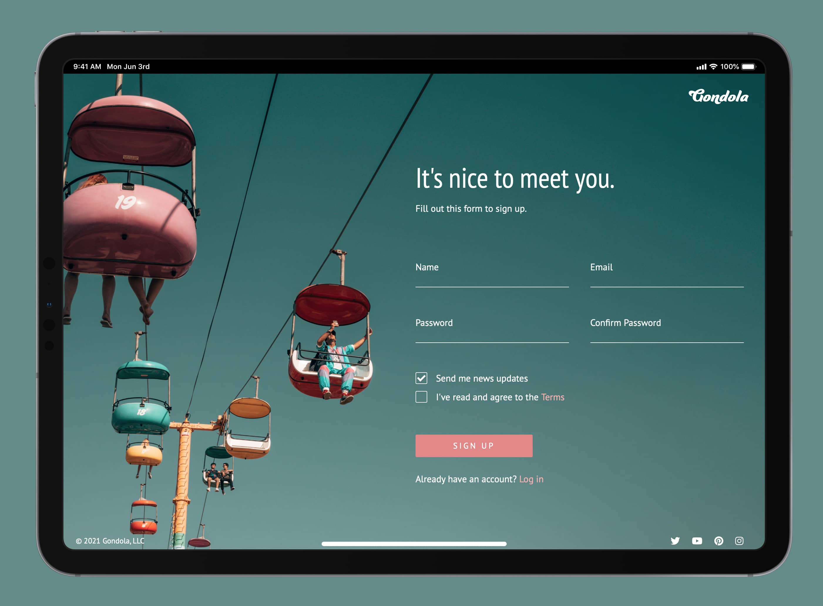 Maybe you need to sign up to get email alerts from the local gondola company. Maybe you are creating an account so that you can sign your safety waivers. Either way, here's a pretty form to get that done. View the concept here.